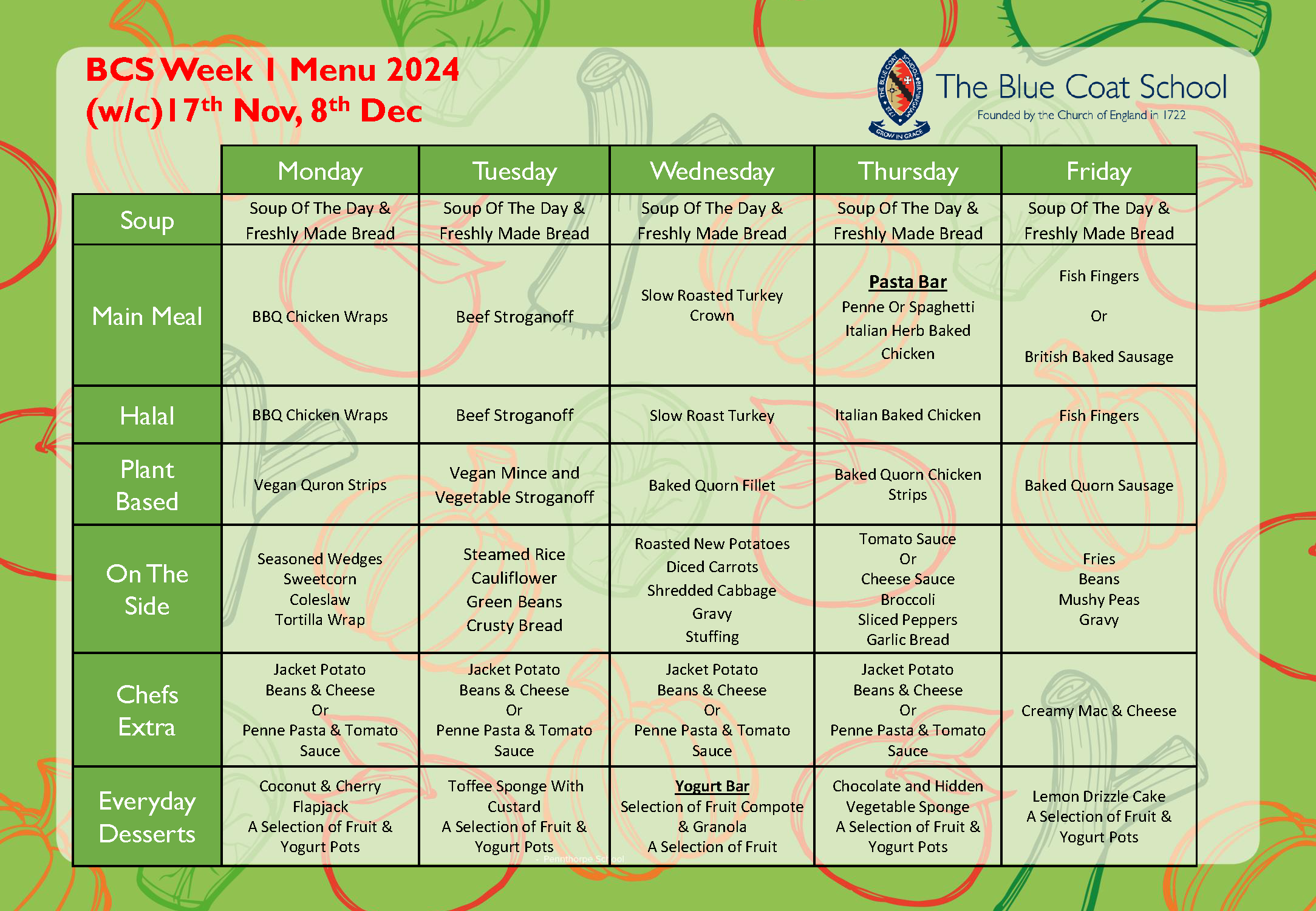 Below is an example of one of the weekly school lunches menu or you can download the full menu for the Michaelmas Term.
