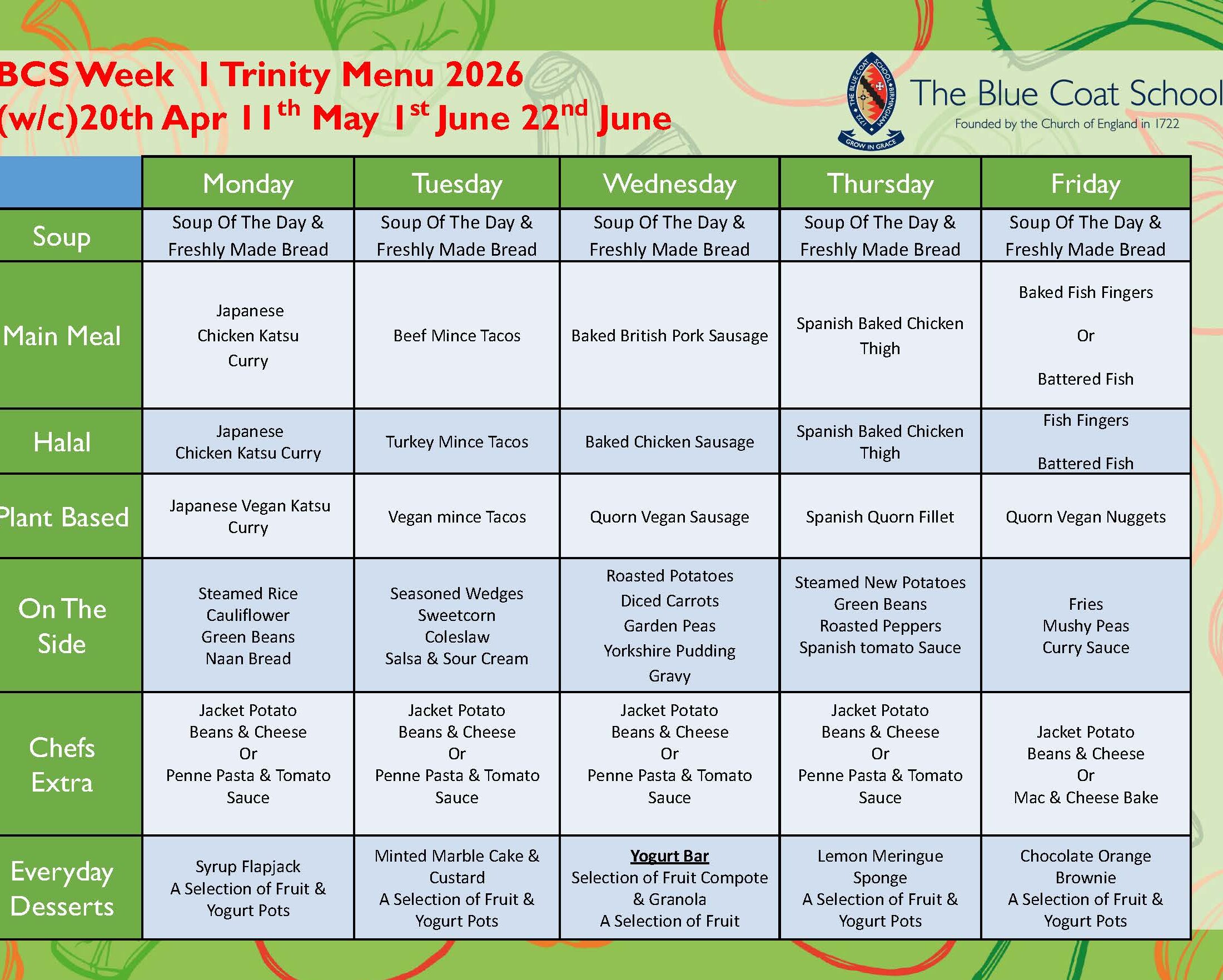 Below is an example of one of the weekly school lunches menu or you can download the full menu for the Lent Term.